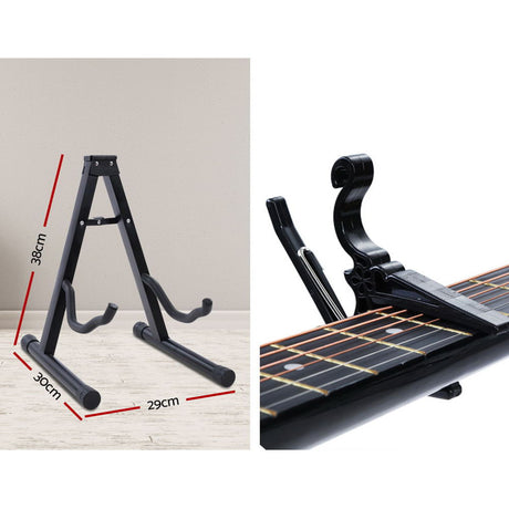 Alpha 38 Inch Acoustic Guitar Wooden Body Steel String Full Size w/ Stand Black