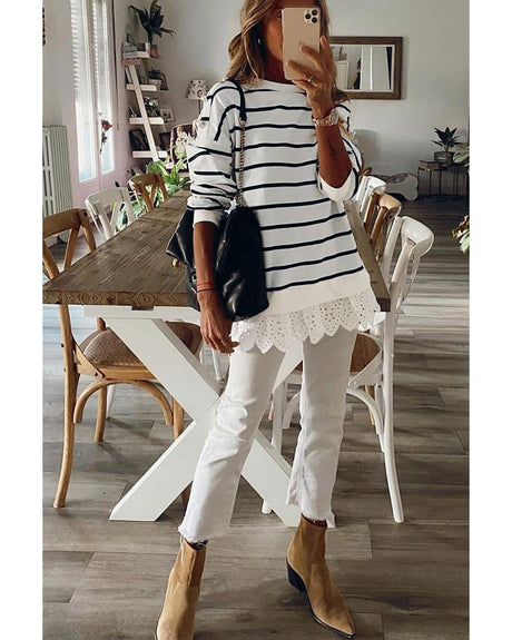 Azura Exchange Striped Lace Spliced Dropped Shoulder Top - S