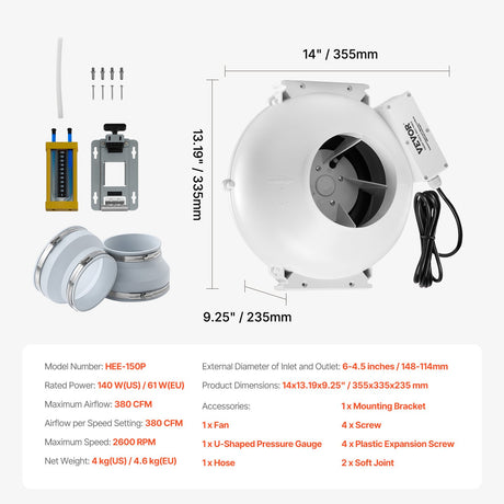 VEVOR 6" to 4.5" Radon Mitigation Fan System Kit Quiet 380 CFM Inline Duct Fan