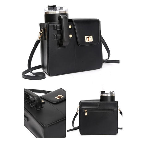Leather Shoulder Bag For Water Bottles Fits Most Brands - Black