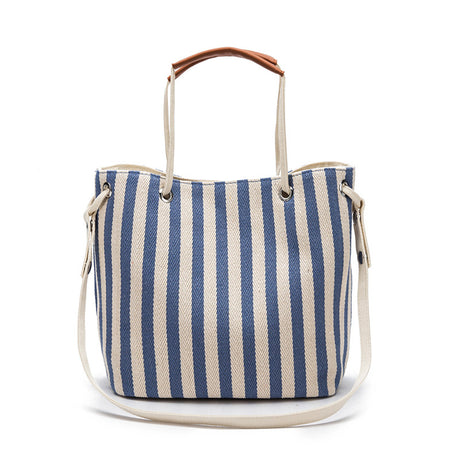 Light Blue Stripes Canvas Bucket Tote Bag with Leather Handle