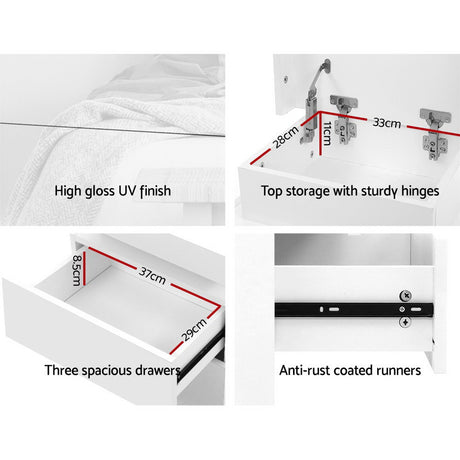 Artiss Bedside Table LED 3 Drawers - MORI White