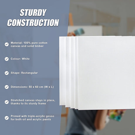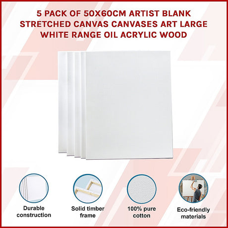5 pack of 50x60cm Artist Blank Stretched Canvas Canvases Art Large White Range Oil Acrylic Wood