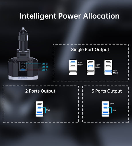 CHOETECH TC0033 105W USB-C+USB-A Fast car charger with Stretchable USB-C + Lightning cables