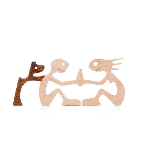Handmade Wooden Statue Sitting Family and Dog Craft Home Decor - B02