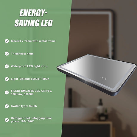 Rectangular Mirror LED Anti-Fog Illuminated Bathroom Living Room - 90x70cm