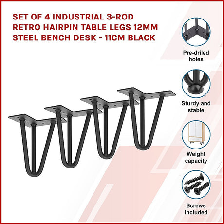 Set of 4 Industrial 3-Rod Retro Hairpin Table Legs 12mm Steel Bench Desk - 11cm Black