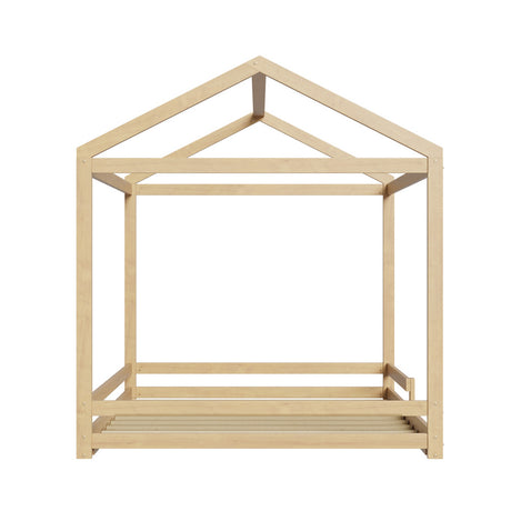 Oikiture Double Kids Wooden Bed Frame House Beds with Fence Natural