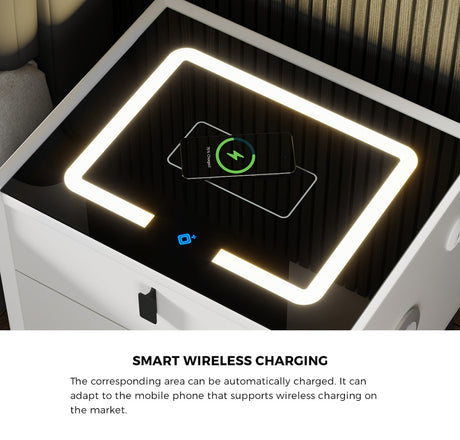 Oikiture Smart Bedside Table Wireless Charging LED Lights 3 Drawers