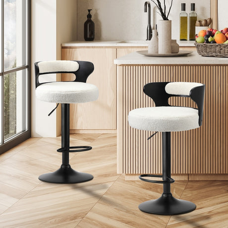 Oikiture 2x Bar Stools Gas Lift Swivel Chairs Wooden Boucle White