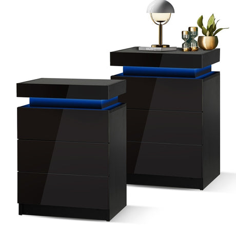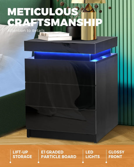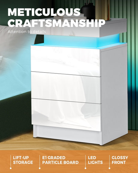 Oikiture Bedside Tables Set of 2 LED Nightstand 3 Drawers