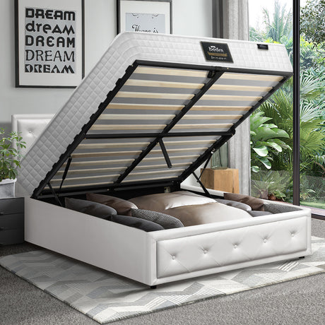 Oikiture Bed Frame with Mattress King Single Gas Lift White