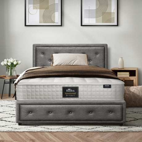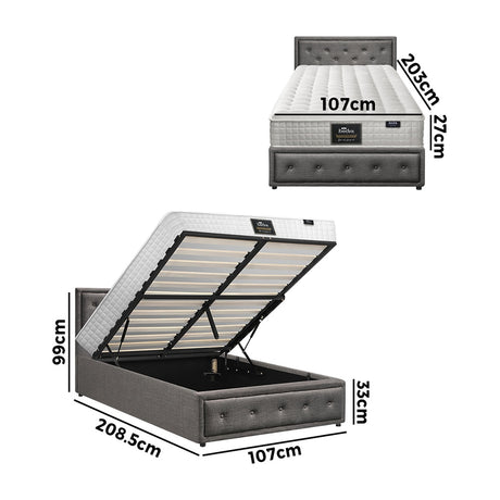 Oikiture Bed Frame with Mattress King Single Gas Lift Grey Fabric