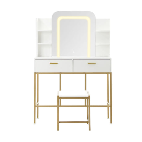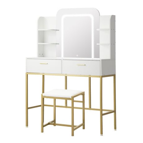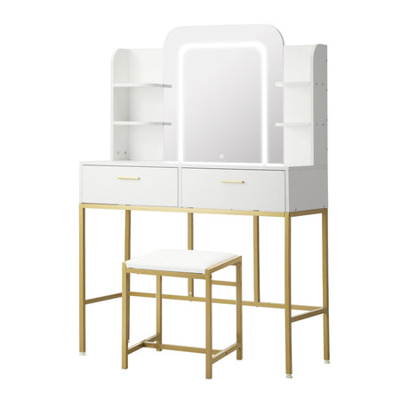 Oikiture Dressing Table Stool Set LED Mirror Vanity Desk White Gold
