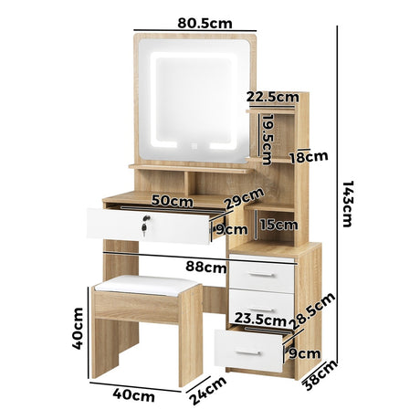 Oikiture Dressing Table Stool Set LED Light Mirror Wooden White