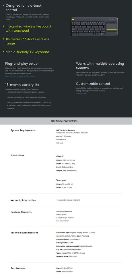 Logitech K400 Plus Wireless Touch Keyboard with Integrated Touchpad - Black