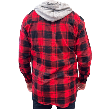 Men's Red and Black Hooded Flannelette Shirt - Long Sleeve Cotton Flannel - 3XL