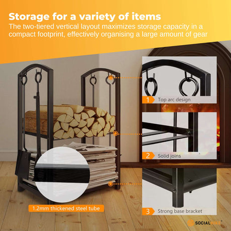 Social Hike Firewood Rack Stand and Fireplace Tool Set for Log Holder Storage