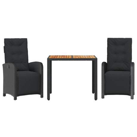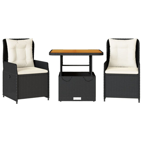 3 Piece Bistro Set with Cushions Black Poly Rattan Acacia Wood