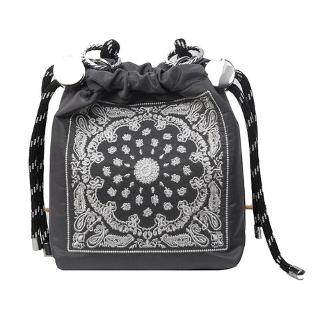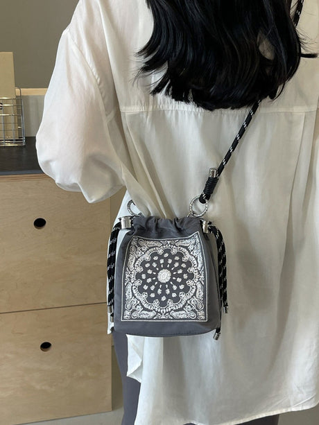 Chic Drawstring Bucket Bag with Intricate Print - Adjustable Rope Strap, Lightweight Fabric(Gray)