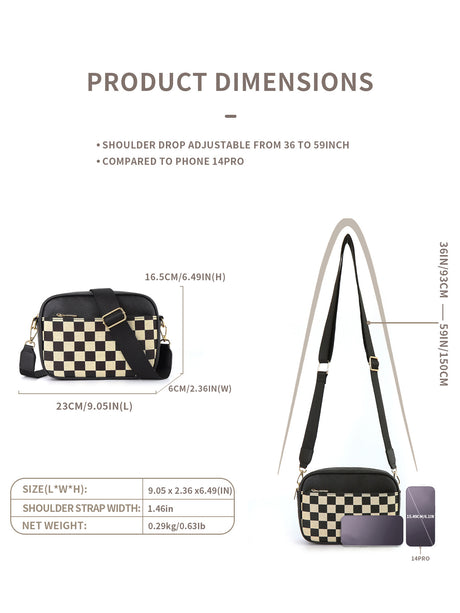 Black Stylish Checkerboard Crossbody Camera Bag - PU Leather with Adjustable Wide Strap