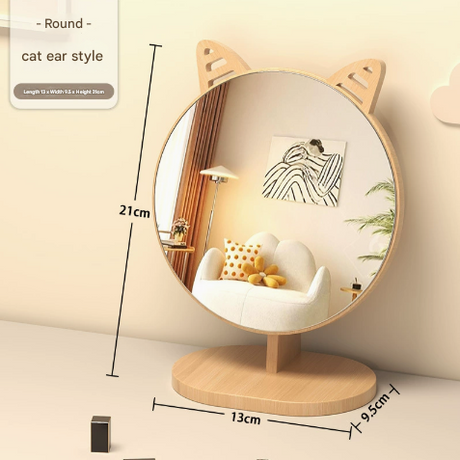 Cartoon Cat Ear Mirror Tabletop Makeup Mirror - Large Wooden Swivel Vanity Mirror for Desk