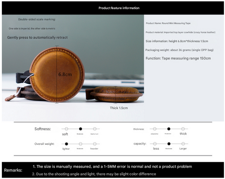 Coffee Side Band Mini Leather Tape Measure - 1.5m/60in - Round With Hook And Pattern