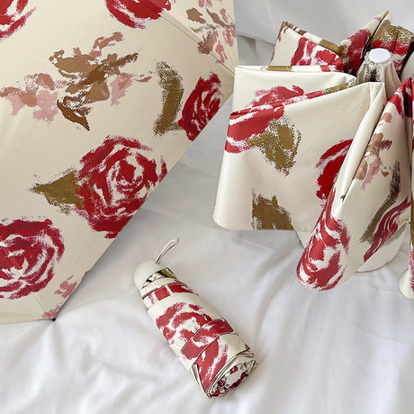 Red Rose Mini 5-Fold Umbrella - Portable, Anti-UV, Black Glue Coating