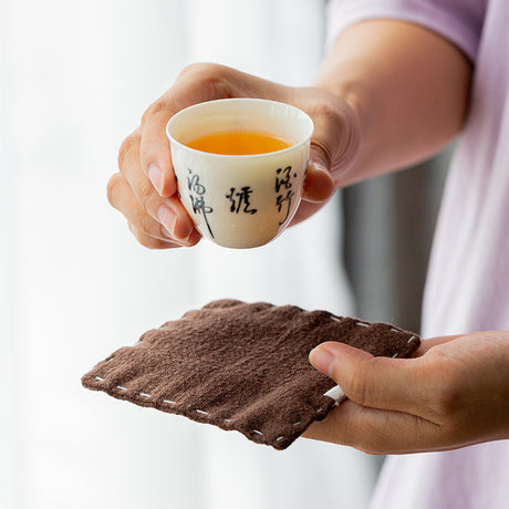 Brown Chinese Style Linen Coasters - Set of 4, Hand-Embroidered Tea Mats (9x9cm)