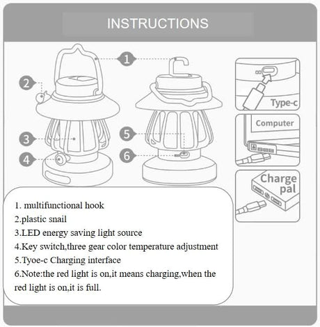 White Retro Snail Night Light - Portable Rechargeable Camping Lantern with Hook, 3-Color Dimming