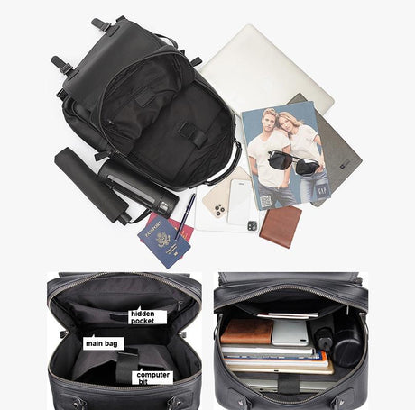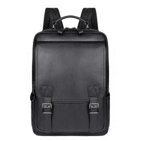 Men Black Cowhide Leather Backpack for Casual Business with Laptop Compartment