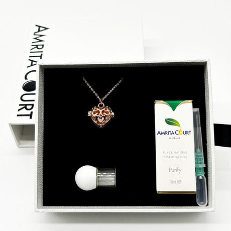 Gift Box - Love Heart Rose Gold Aroma Necklace + Purify Oil Blend