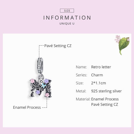 925 Sterling Silver Letter M Pendant For Diy Bracelets & Necklaces