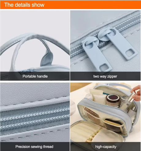 White Portable PU Leather Makeup Bag with Detachable Divider - Travel Cosmetic Organizer
