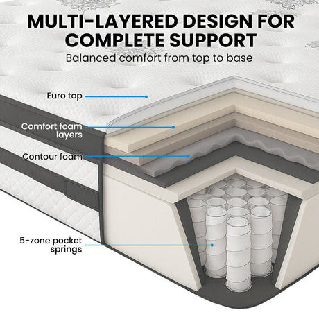KINGSTON SLUMBER Luxury 34cm Double Mattress, Medium Firm, Euro Top, 5-Zone Pocket Spring Foam