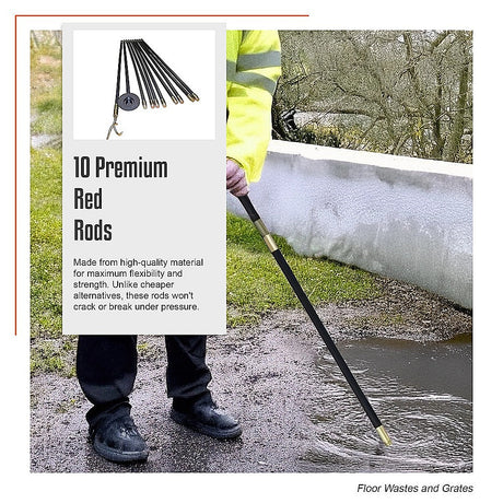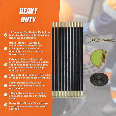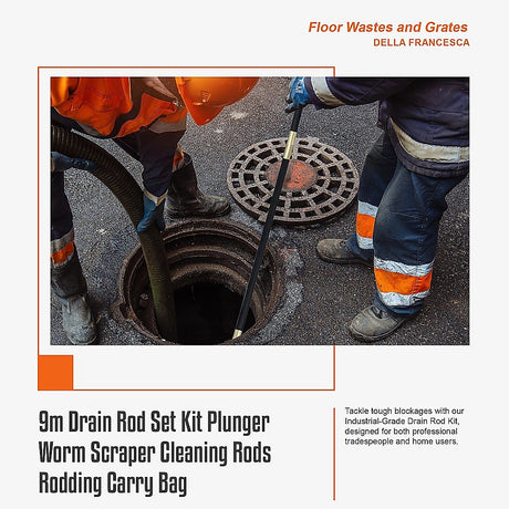 9m Drain Rod Set Kit Plunger Worm Scraper Cleaning Rods Rodding Carry Bag
