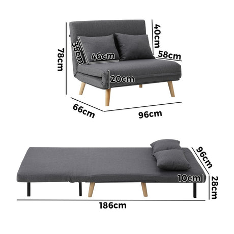 Oikiture Lounge Sofa Bed Linen Fabric Double Seat Grey