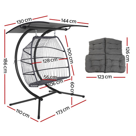 Gardeon Outdoor Egg Swing Chair Wicker Furniture Pod Stand Canopy 2 Seater Grey