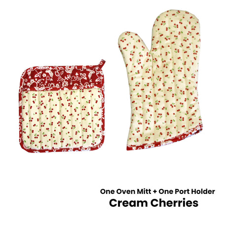 Set of 100% Cotton Printed Oven Mitt + Pot Holder Cream Cherries
