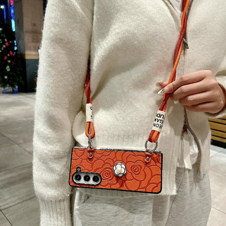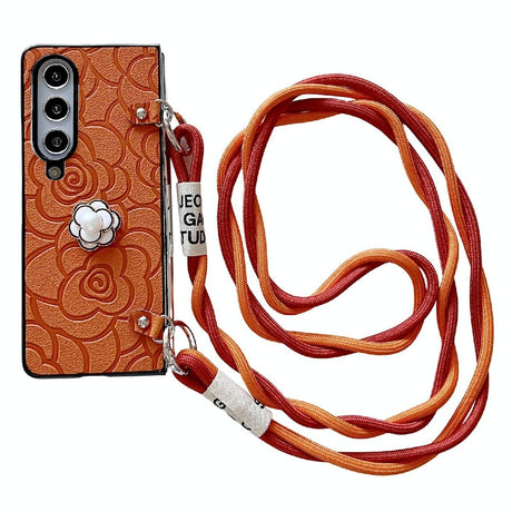 For Samsung Galaxy Z Fold4 5G Camellia Pattern Phone Case With Lanyard - Orange