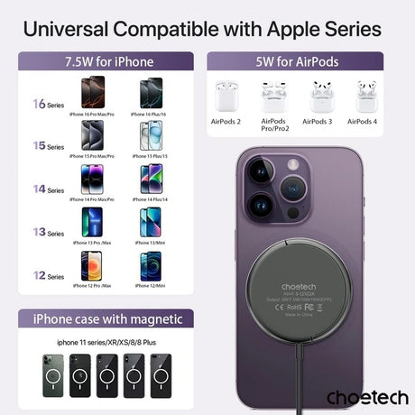 CHOETECH T697-F 15W/7.5W/5W magnetic charger for iPhone, Air Pods and more 1.5M Black