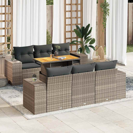 7 Piece Garden Sofa Set with Cushions Grey Poly Rattan Acacia