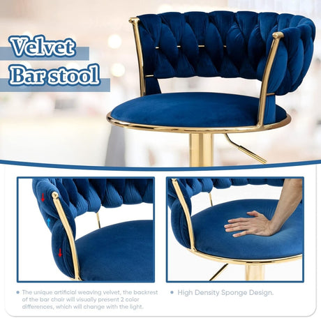 2x Height Adjustable Swivel Bar Stool Velvet Golden Base Barstools Chairs Padded Seat- Blue