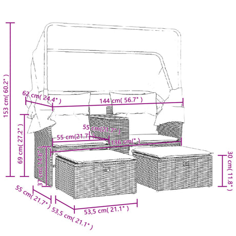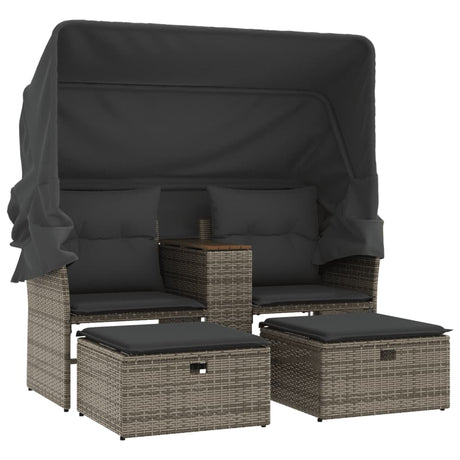 Garden Sofa 2-Seater with Canopy and Stools Grey Poly Rattan