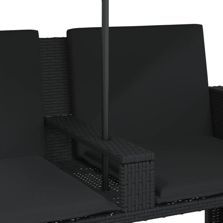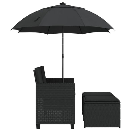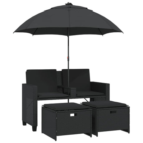 Garden Sofa 2-Seater with Parasol and Stools Black Poly Rattan