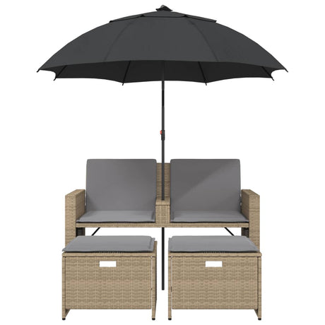 Garden Sofa 2-Seater with Parasol and Stools Beige Poly Rattan