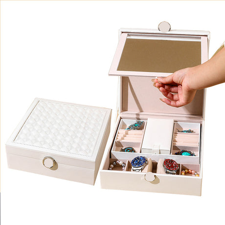 White Luxury Quilted Jewelry Storage Box with Mirror and Multi-Layer Compartments