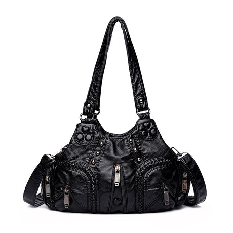 Black Women's Vintage Studded Hobo Bag - Soft Washed Leather Multi-Pocket Shoulder & Crossbody Purse
