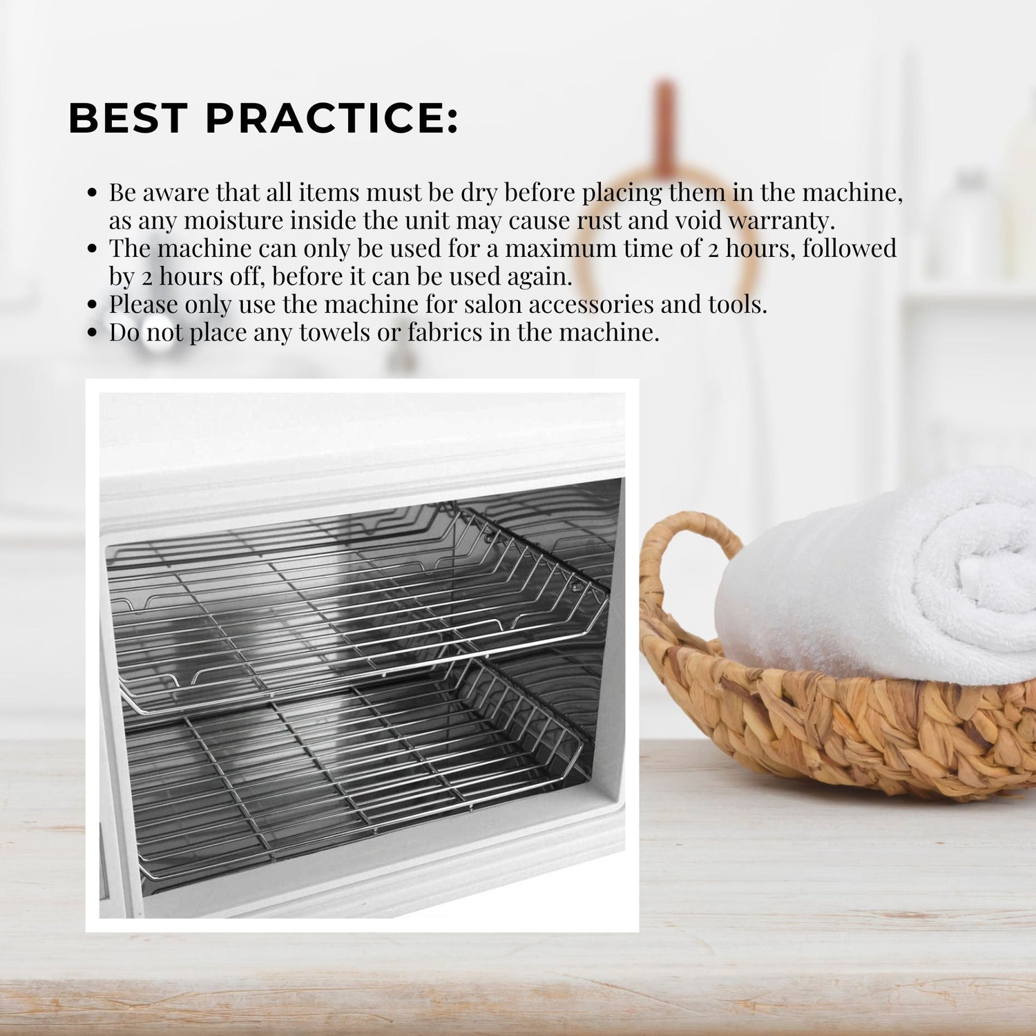 The steriliser features a convenient door that swings open from left to right, allowing for easy loading and unloading of your items. Remember to ensure that all items are completely dry before placing them in the unit to avoid any moisture-related issues.