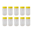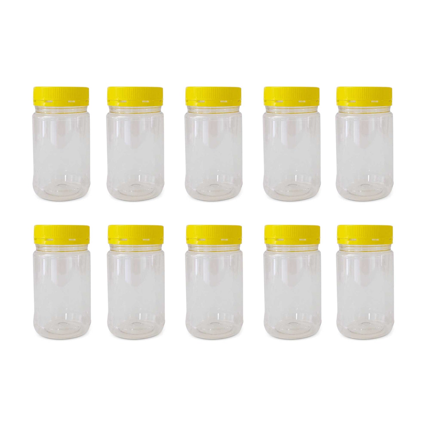 Round plastic empty food grade jars with yellow tamper evident lids, commonly used for packing food products and items such as beads, crafts, decorations, honey, grains, beans etc.